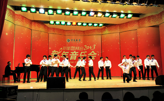 校党委书记齐岳在音乐会前致新年贺词,他代表学校党委、行政,向全体师生员工,各级领导和各界友人,离退休同志和广大校友,致以节日的问候和衷心的感谢!他指出,2012年是学校发展进程中极不平凡的一年,全体师生员工在自治区党委、政府的关怀和校党委、行政的坚强领导下,凝心聚力,和谐奋进,取得了一系列重大突破。学校成功召开第六次党代会,确定了今后一个时期的指导思想、发展目标和具体任务,进一步明确了奋斗目标;顺利通过了“211工程”三期建设国家验收;入选“中西部高校提升综合实力”学校,跨入了国家建设“有特色,高水平”大学的新阶段;教育教学改革不断深化,人才培养质量不断提高;师资队伍建设不断加强,人才队伍结构进一步优化;有利于科研持续发展的体制机制加快形成,服务地方建设呈现新亮点;海外交流与合作层次提升,国际化办学合作平台不断拓展;师生学习、工作和生活条件持续改善,和谐校园和大学文化建设取得新的成就;创先争优活动和学习型党组织建设持续推动,党的建设和思想政治工作取得实效。这些成绩的取得,凝聚着全校师生员工的智慧和心血,离不开各界友人的关心、帮助和支持,2012年所取得的成绩是大家团结拼搏、努力奋斗的结晶。齐书记希望在新的一年,要深入学习贯彻党的十八大精神,认真落实学校第六次党代会确定的目标和任务,转变作风,加大落实力度,寻求重点突破,促进学校科学、和谐、开放、持续发展,实现学校新的跨越。