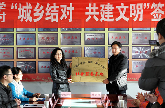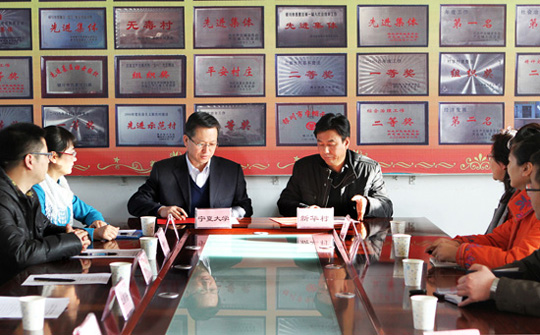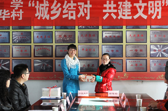 仪式上,赵利宁和秋万全代表双方签署了文明共建协议并为宁夏大学与镇北堡镇新华村“城乡结对共建文明点”揭牌。统战部部长井惠敏为新华村授予“宁夏大学统一战线‘同心工程’社会服务基地”牌匾,宣传部副部长武林波代表学校文明办向新华村“农村书屋”赠送文化建设书籍100余册。