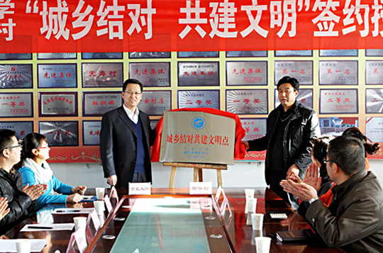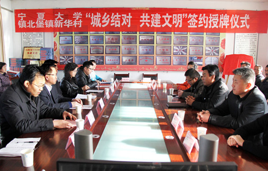【宁夏大学新闻中心讯 黄二宁、张鹏/图 武林波/文】为深入贯彻党的十八大精神和自治区文明委关于结对共建的工作要求,充分发挥宁夏大学全国文明单位的引领示范作用,加快推进生态文明村和农村精神文明示范点建设。12月26日下午,我校在西夏区镇北堡镇新华村举行了“城乡结对、共建文明”签约授牌仪式,校党委副书记赵利宁,银川市委宣传部副部长、文明办主任杜翔普,银川市文明办志愿服务科科长马小平,西夏区委文明办副主任任雅洁,镇北堡镇纪委书记吴延状,新华村党支部书记、村委会主任秋万全以及双方单位师生和村民代表出席签约仪式。我校党委宣传部部长李斌主持仪式。