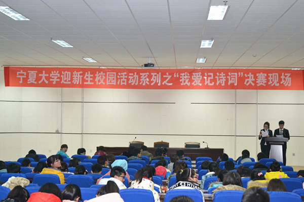 【宁夏大学新闻中心讯 团委】 为弘扬中华传统文化,营造书香校园氛围,由共青团宁夏大学委员会主办,宁夏大学学生会承办的“国学在宁大”系列活动之“我爱记诗词”国学达人选拔赛于12月13日晚在校本部A区文科楼东报告厅举行。