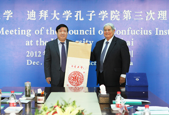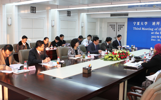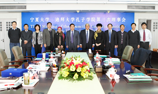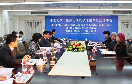 【宁夏大学新闻中心讯 黄二宁/图 胡玥/文】12月10日,宁夏大学 迪拜大学孔子学院第三次理事会在我校A区主楼11楼会议室召开。迪拜大学校长、孔子学院理事长哈夫尼、迪拜大学孔子学院副理事长何建国、迪拜大学孔子学院外方院长希曼特、中方院长瞧秀梅,我校党委副书记王燕昌、副校长王春秀等相关部门负责人出席会议。