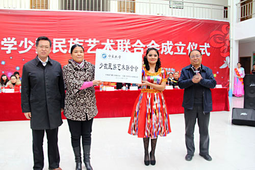 校党委副书记赵利宁、副校长李伟为少数民族艺术联合会授牌。