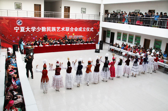 【宁夏大学新闻中心讯 黄二宁、张鹏/图 团委 预科学院/文】 12月7日下午,宁夏大学南校区民族预科教育学院大厅内,歌声嘹亮,舞姿翩翩。校党委副书记赵利宁、副校长李伟和党委组织部、党委宣传部、团委、学生处等部门负责人、民族预科教育学院的领导及师生300余人欢聚一堂,共同庆祝宁夏大学少数民族艺术联合会学生社团隆重成立。成立仪式由民族预科教育学院党总支副书记郑燕玲主持。