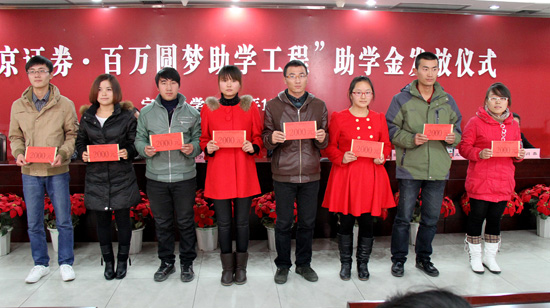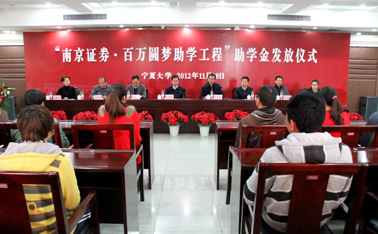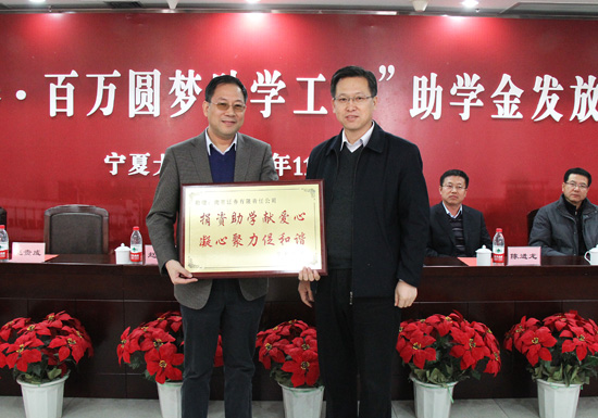 据悉,“南京证券·百万圆梦助学工程”是由自治区团委、南京证券宁夏分公司、宁夏青基会联合实施,资助对象是宁夏大学、北方民族大学、宁夏医科大学、宁夏师范学院的二年级大学生共160名,每校资助40名,连续资助3年。助学金按年度发放,每人每学年发放2000元,共6000元。