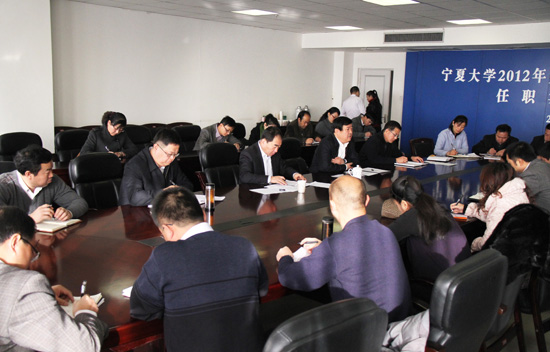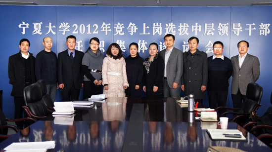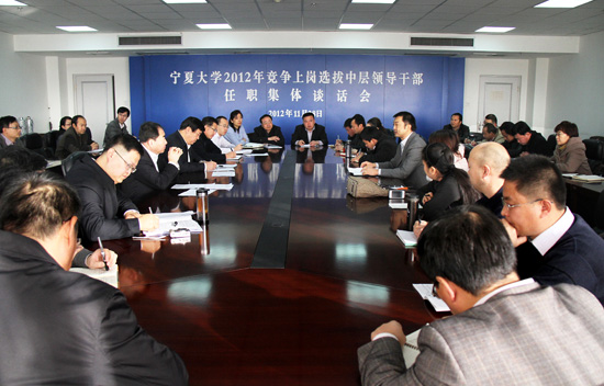 【宁夏大学新闻中心讯 黄二宁/图 胡玥/文】11月28日上午,在A区主楼十楼会议室,我校举行2012年竞争上岗选拔中层领导干部任职集体谈话会。校党委书记齐岳、校长何建国、组织部部长高继明以及各选拔单位、挂职单位领导出席会议。