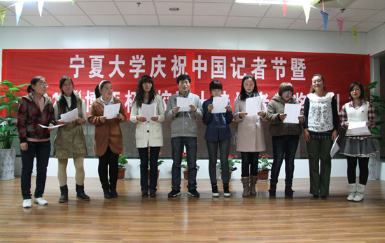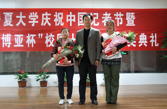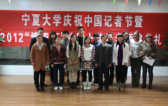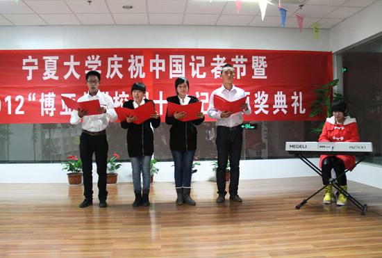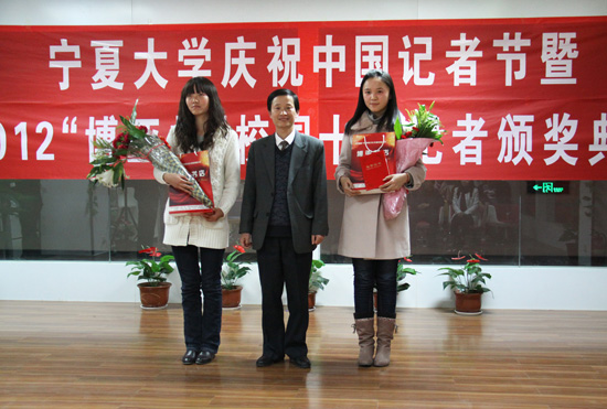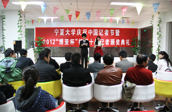 【宁夏大学新闻中心讯 陈思彤/文 黄二宁、张鹏/图】11月8日晚,正值令人振奋鼓舞的党的十八大召开之际,由宁夏大学党委宣传部主办,宁夏大学记者团承办,宁夏大学博亚书店协办的宁夏大学庆祝中国记者节暨2012“博亚杯”校园十佳记者颁奖典礼在宁夏大学C区一楼博亚书店隆重举行。
