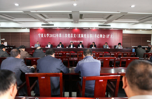 【宁夏大学新闻中心讯 黄二宁/图 胡玥/文】9月29日上午,在综合楼六楼会议室,我校召开2012年第三次党总支(直属党支部)书记例会。校党委书记齐岳、校长何建国、副书记赵利宁、王燕昌、副校长李伟、李星、张成、王春秀及学校各相关部门负责人参加会议。