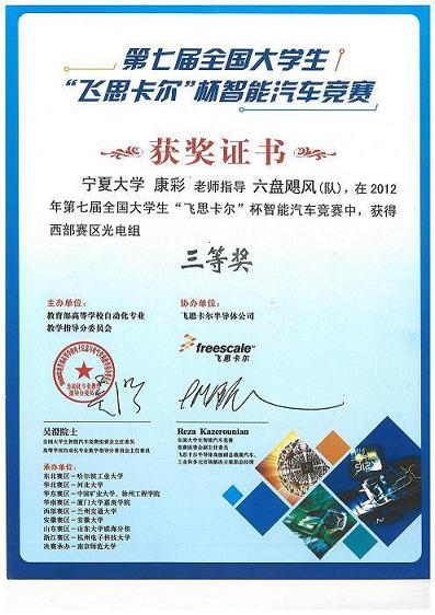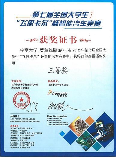 【宁夏大学新闻中心讯 物电学院 闵星】2012年7月21—24日在兰州举行的全国第七届“飞思卡尔”智能汽车竞赛中,由物理电气信息学院康彩老师和张冬老师指导,学生金少华、杜立强、马建华参加的摄像头组和弋伟国、宁瑞昊、武吉龙参加的光电组顺利完成比赛科目,获得西部赛区三等奖。