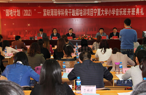 【宁夏大学新闻中心讯 高师培训中心】9月16日上午,“国培计划(2012)”—紧缺薄弱学科骨干教师培训项目小学音乐培训班开班典礼在我校高校师资培训中心6楼多功能厅隆重举行。副校长王燕昌、宁夏教育厅师资处副处长张鲁生出席开班典礼。参加开班典礼的还有项目首席专家我校音乐学院院长刘明,宁夏高校师资培训中心主任和润、书记周福盛以及来自全国8个省、市、自治区的50名小学音乐骨干教师。开班典礼由和润主持。