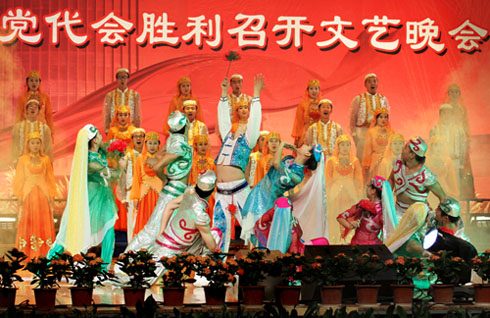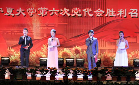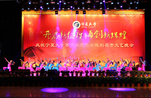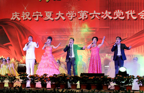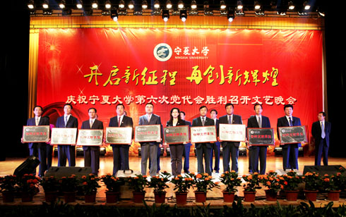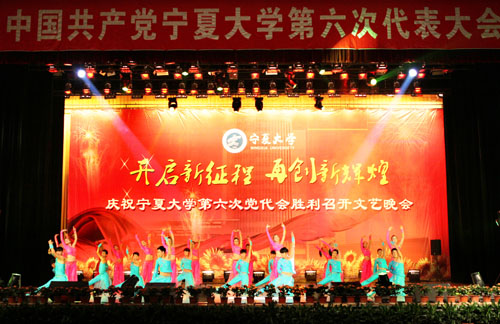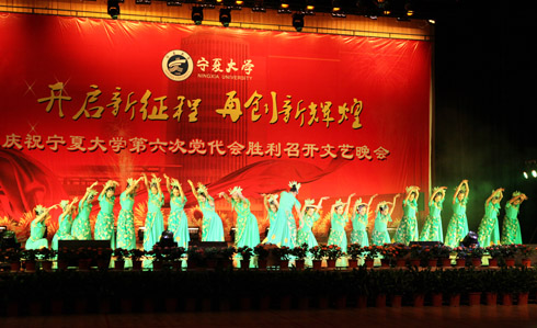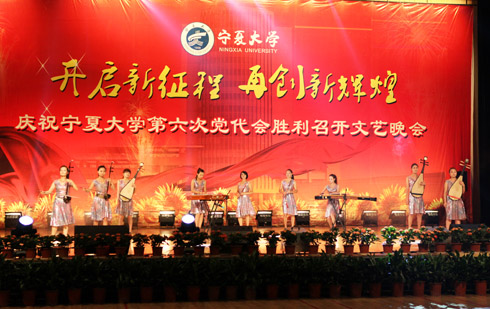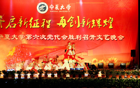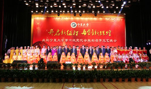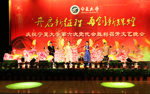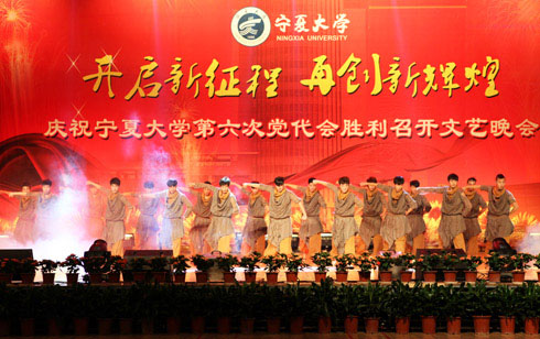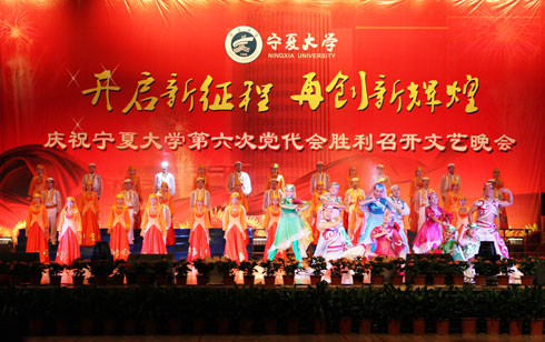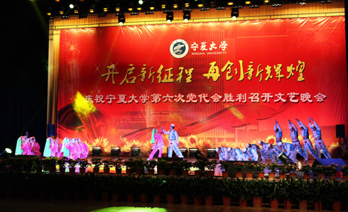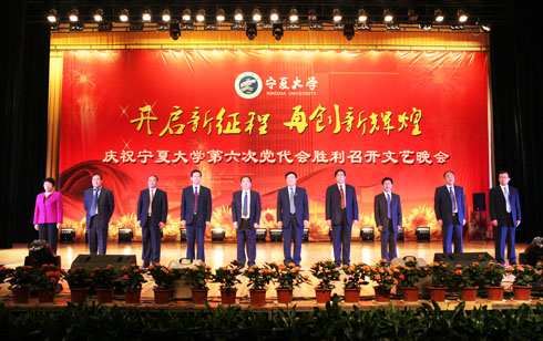在刚刚闭幕的宁夏大学第六次党代会上新当选的校党委书记齐岳,副书记何建国、赵利宁、王燕昌,校党委常委李伟、李星、谢应忠、张成、纪委书记孔斌、王玉炯以及学校第六次党代会的全体代表和部分师生代表,一同观看了演出。