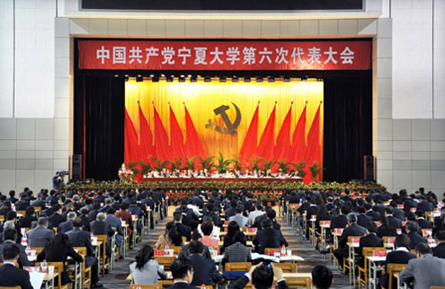 开幕式会场庄严隆重。主席台上方悬挂着“中国共产党宁夏大学第六次代表大会”的会标,10面鲜艳的红旗簇拥着金色的党徽,“群策群力集聚民智,共商学校发展大计”、“开拓创新科学发展,共绘宁大宏伟蓝图” 等各种鼓舞人心的标语格外醒目。