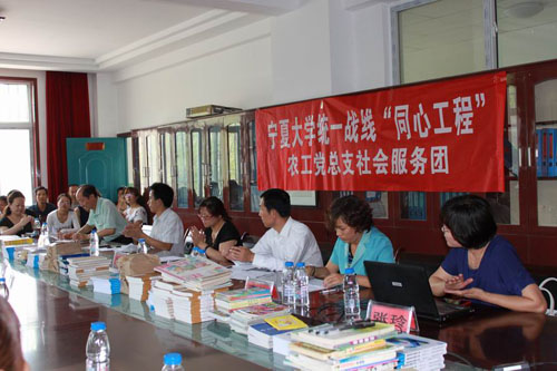 在启动仪式上,农工党宁大总支党员向贺兰山农牧场小学捐赠了上千本少儿图书。