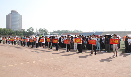 体育场彩旗飞扬,人声鼎沸,“坚持锻炼 增强体质 身心健康 快乐工作”,“运动是快乐的源泉,快乐是生命的财富”等标语渲染了赛场上热烈的气氛。校领导何建国、许兴、赵利宁、孔斌以及各学院、单位的领导、部门工会主席及1000多位教职工,参加了第四届教职工趣味运动会活动。校工会主席尚晓东主持开幕式。