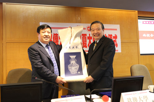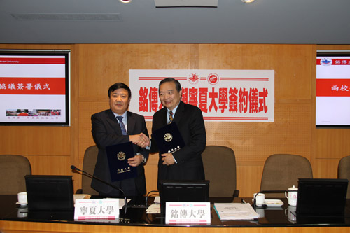 4月16日,我校与台湾铭传大学在台北举行了合作交流签字仪式,铭传大学行政管理部门及院系一、二级主管80多人参加了签字仪式。签约仪式上何建国校长和铭传大学李铨校长代表两校发表了热情洋溢的讲话,并互赠了纪念品。随后,两校签署了《宁夏大学与铭传大学学术交流合作协议书》,内容涉及教师互访、学生交换、合作研究等。签字仪式结束后,代表团在铭传大学王金龙副校长的陪同下,参观了铭传大学桃园校区,观摩了英语系、日语系及汉语言文化系的情景教学和资讯网络处数字化校园建设。