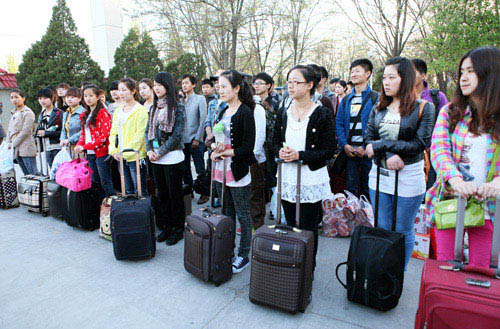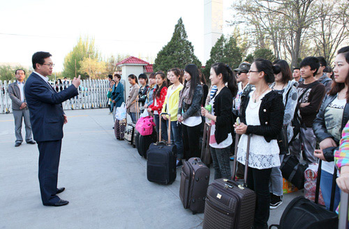 【宁夏大学新闻中心讯 黄二宁/图 校团委/文】4月25日晚7时,我校49名师生启程赴京参加由中宣部、教育部、团中央联合主办,中央电视台承办的2012年“五月的鲜花”——全国大学生“永远跟党走”大型校园文艺汇演。校党委副书记赵利宁,校团委、音乐学院负责人在校本部C区为参加演出的师生送行。赵利宁副书记指出,参加“五月的鲜花”演出活动是我校参演师生的荣誉,也是学校的骄傲,不仅可以展现我校学子的青春风采,而且也能体现我校学生积极向上的精神风貌。希望参演的同学以最佳的精神状态、最高的艺术水平,严格遵守纪律,坚决听从指挥,克服各种困难,团结友爱,尽最大努力,出色、安全地完成演出任务,不辜负学校党委、行政和全校师生的殷切期望。