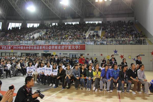 【宁夏大学新闻中心讯 团委 】由共青团中央学校部、全国学联办公室、新东方教育科技集团联合主办,宁夏大学团委承办的“梦想之旅”2012中国大学生励志系列公益讲座于4月23日晚在我校大学生活动中心成功举行。新东方教育科技集团董事长兼总裁俞敏洪、自治区团委学校部部长晋阳、宁夏大学团委书记冯奎等出席。我校及我区财经职业技术学院、建设职业技术学院、司法警官职业技术学院等6000余名学生聆听了讲座。