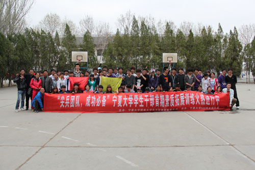 【宁夏大学新闻中心讯 大学生文化素质教育基地】 2012年4月15日,由宁夏大学国家大学生文化素质教育基地、宁夏大学KAB创业俱乐部联合举办的宁夏大学首届学生干部户外素质拓展训练在宁夏大学北校区篮球场火热展开。本次活动特邀宁夏蓝山集团培训经理柳海宁先生,为来自宁夏大学团委学生会、社团联合会、各学院学生会、各社团的60名学生干部进行了为期一天的培训课程。