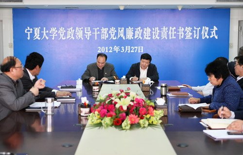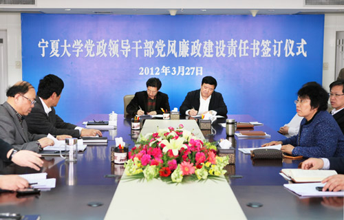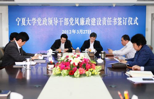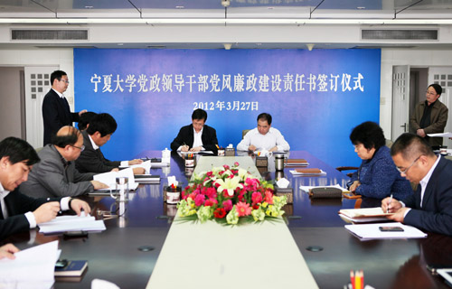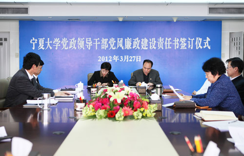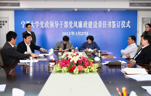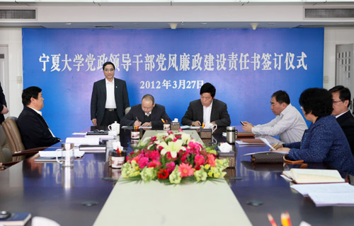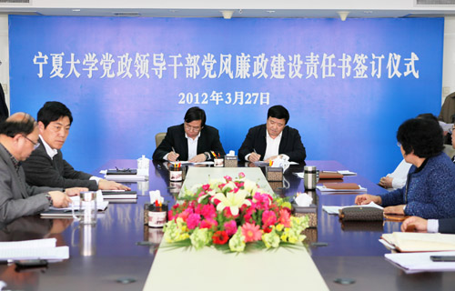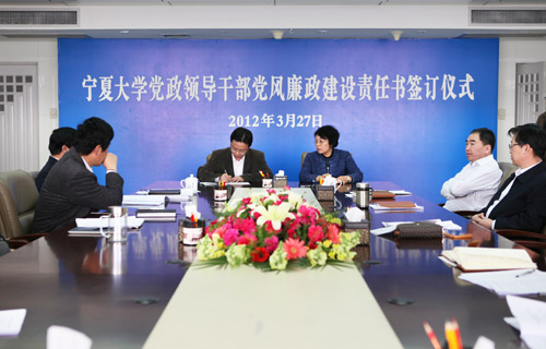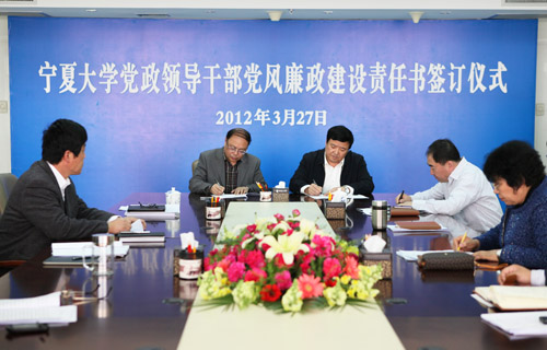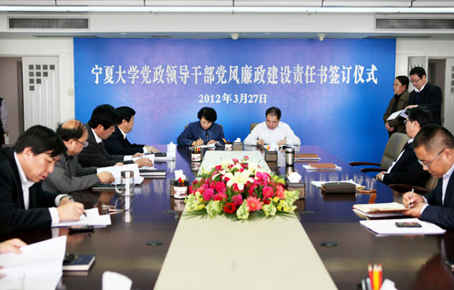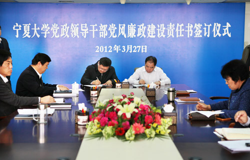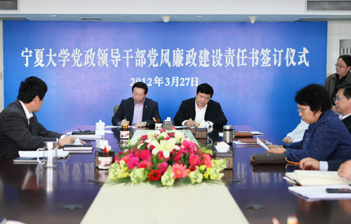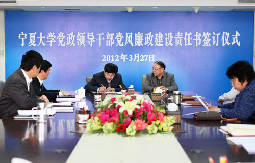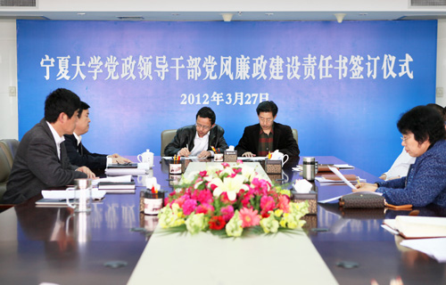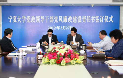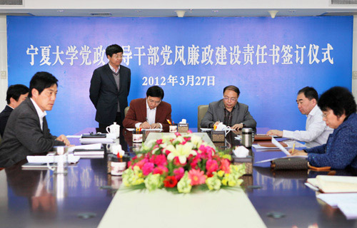 【宁夏大学新闻中心讯 黄二宁∕图 张丽艳∕文】3月27日下午,我校党政领导干部党风廉政建设责任书签订仪式在主楼11楼会议室举行。校纪委书记孔斌主持签订仪式,学校领导以及分管单位负责人参加了会议。