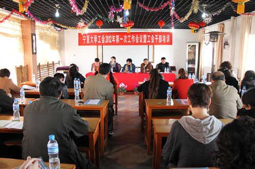 【宁夏大学新闻中心讯 黄二宁∕图、文】3月17日上午,宁夏大学工会2012年第一次工作会议暨工会干部培训在银举行,校纪委书记孔斌,自治区总工会教科文体工会主席刘涵,校工会主席尚晓东、校工会副主席、妇女工作委员会主任刘双萍、校工会副主席高燕、蒋志忠出席会议。校教代会执行委员会委员,校工会委员会委员、女工委员会委员、经审委员会委员及各分工会主席近80人参加了会议。校工会主席尚晓东主持会议。
