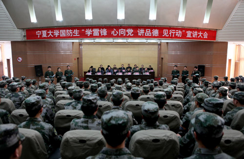 【宁夏大学新闻中心讯 黄二宁∕图 驻校选培办∕文】3月7日下午,在《学习雷锋好榜样》的嘹亮歌声中,我校国防生“学雷锋、心向党、讲品德、见行动”活动在B区图书馆报告厅正式拉开序幕。