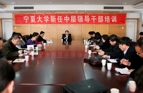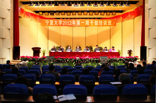 【宁夏大学新闻中心讯 黄二宁/文、图】为了进一步提升全校领导干部的综合素质,建设一支适应高等教育改革发展的高素质管理干部队伍,校党委于1月18日,在音乐学院音乐厅举办了宁夏大学2012年第一期干部培训班。校党政领导齐岳、何建国、赵利宁、许兴、李伟、王燕昌、李星、张成、孔斌出席会议,全校副处级以上领导干部及2011年以来新提拔任用的干部参加了培训学习。