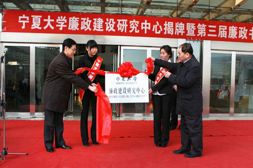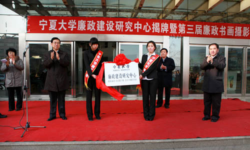 【宁夏大学新闻中心讯 黄二宁/图 翟伟/文】为贯彻党的十七大和十七届六中全会精神,落实自治区党委常委、纪委书记陈绪国同志在宁夏大学考察时的讲话精神,大力推进廉政建设,宣传廉政文化,营造良好的校园廉政文化建设氛围,我校廉政建设研究中心揭牌暨第三届廉政书画摄影作品展开幕式12月15日下午在美术学院门前举行。自治区纪委副书记陶进,我校党委书记齐岳、校长何建国、副书记赵利宁、纪委书记孔斌出席开幕式。开幕式由赵利宁副书记主持。