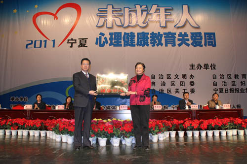 启动仪式上,关工委副主任朱佩玲向宁夏大学颁发了“自治区青少年心理健康教育辅导中心牌匾”.宁夏大学党委副书记赵利宁代表学校接受了牌匾。赵利宁副书记在表态发言中指出,宁夏大学要充分发挥学校心理专业的学科优势和人才优势,努力将“自治区青少年心理健康教育辅导中心”办出水平,办出特色。服务于青少年的健康发展,服务于宁夏的经济社会发展。