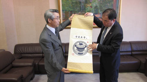 齐岳书记向岛根县立大学本田雄一校长赠送宁夏大学礼品