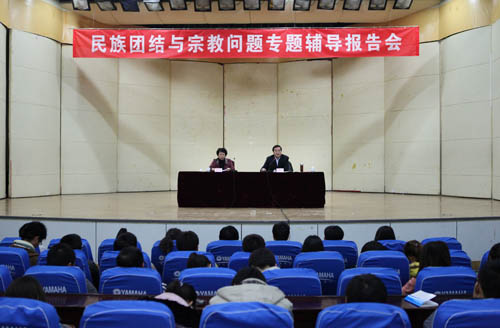兰德明副巡视员在报告中着重讲述了当前宗教的基本状况、宗教渗透问题分析以及大学生如何对待宗教问题等。报告内容丰富,理论联系实际,讲解问题透彻,具有较强的现实性和指导性,对我校师生员工了解和把握党的民族宗教政策,充分认识高校宗教工作的特殊性和重要性,教育引导师生正确认识和对待宗教问题,提高正确处理宗教问题的能力,进一步做好我校民族宗教工作起到积极的促进作用。