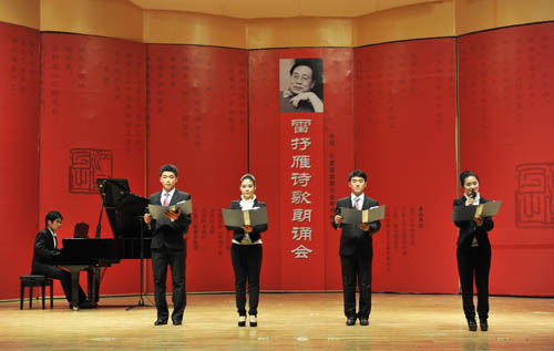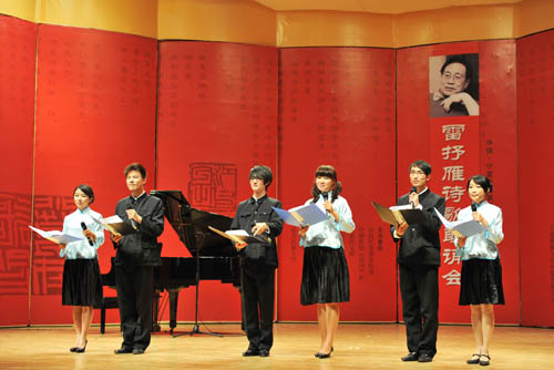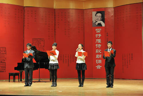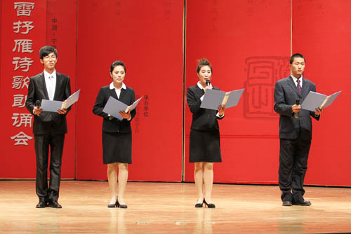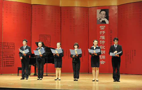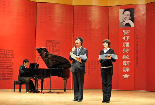 【宁夏大学新闻中心讯 黄二宁/图 翟伟/文】11月11日晚,由自治区党委宣传部、中国作协《诗刊》社、自治区文联、自治区文化厅、宁夏日报报业集团、宁夏广电总台、自治区旅游局、宁夏大学、北方民族大学主办,银川市诗歌学会、宁夏大学党委宣传部、宁夏广播电视报社、宁夏雄狮文化传媒有限公司承办的中国·宁夏首届黄河金岸诗歌节雷抒雁诗歌朗诵会在我校音乐学院音乐厅举行。自治区党委宣传部副部长尤艳茹,宁夏大学党委副书记赵利宁,自治区文联副主席哈若蕙,银川市文联主席、《黄河文学》主编郭文斌,宁夏话剧团团长肖强、宁夏文联协会副总编杨梓,宁夏大学党委宣传部部长李斌,北方民族大学党委宣传部部长马少刚等与宁夏大学、北方民族大学师生近500人一同欣赏了诗歌朗诵会。