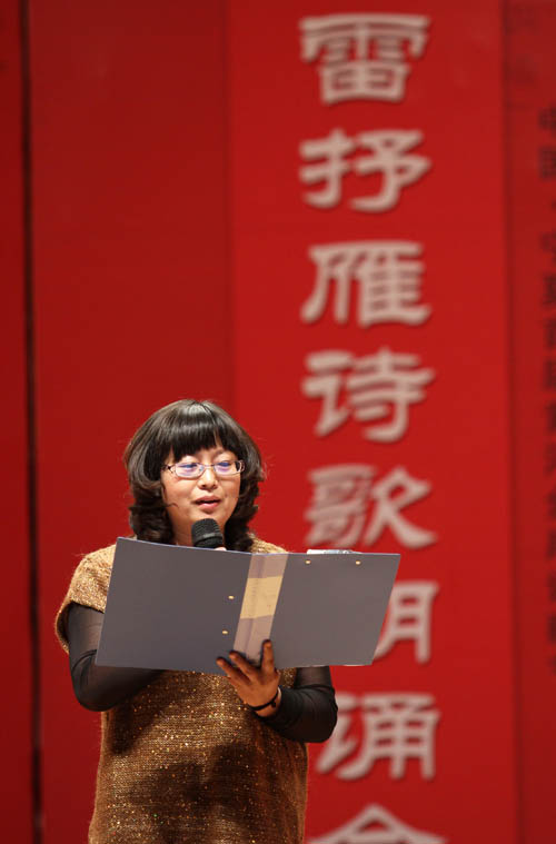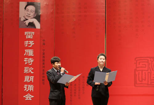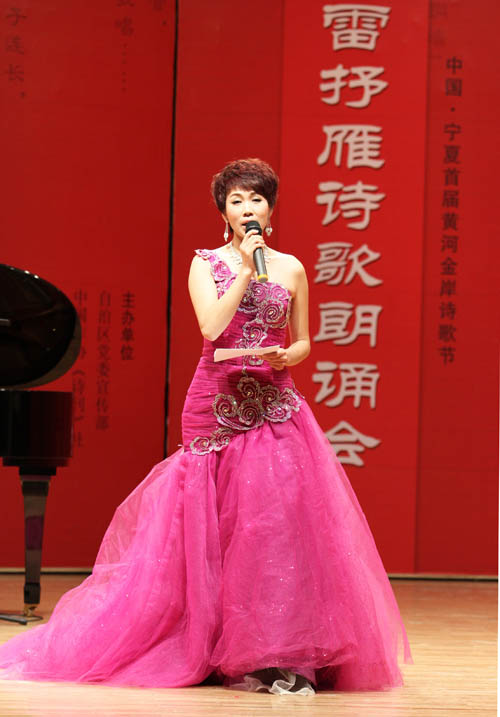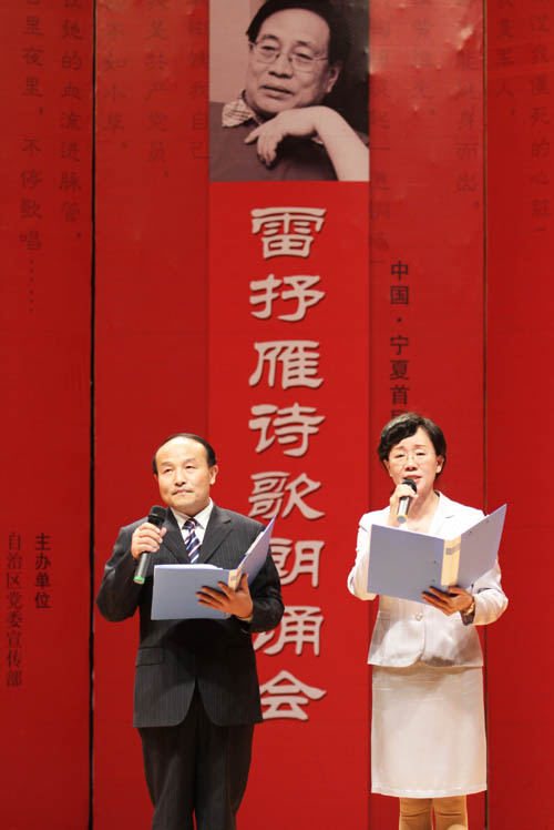在热烈的掌声中,来自宁夏广电总台、黄河文学社、宁夏日报社、宁夏国土资源厅、中国石油宁夏销售公司、宁夏大学、北方民族大学的46名朗诵者饱含深情地朗诵表演了雷抒雁30年来记载中国历史变迁的16首诗歌佳作,桑国红《悬肠草》的温婉低吟、穹宇《掌上心》的豪迈雄浑、哈若蕙《会说话的草》的情深款款,深深打动了在座所有人的心,现场观众热情高涨,掌声不断。杨山虎与杨凤娥完美演绎的抒情长诗《小草在歌唱》,以跌宕起伏的情感和声音将整台诗歌朗诵会推向高潮。浓郁的诗情在空气中流淌,内敛、激越、厚重的声音在配乐压衬下更具张力,一首首人们耳熟能详的诗歌穿透人们的耳膜,直抵心灵深处。