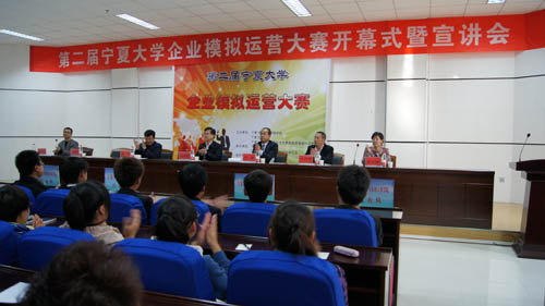 【宁夏大学新闻中心讯 经济管理学院 李文华】10月28日下午,由经济管理学院、校团委、国家大学生文化素质教育基地办公室联合主办,校学生会、经济管理学院团委学生会承办,宁夏大学金融协会、金蝶软件宁夏分公司协办的第二届宁夏大学企业模拟运营大赛开幕式暨宣讲会在A区文科楼报告厅隆重举行。校党委副书记赵利宁出席开幕式并讲话。