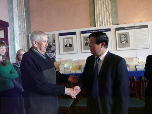 揭牌仪式上,何建国校长代表宁夏大学向东方文献研究所、波波娃所长、克恰诺夫教授等赠送了礼品和学术著作,波波娃所长、克恰诺夫教授向何建国校长回赠了他们的研究成果。