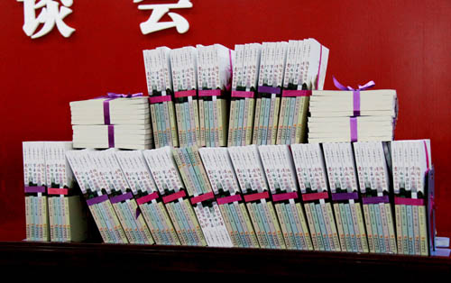 齐岳书记、郭光华副总经理为丛书揭幕。齐岳书记代表我校为北方民族大学、宁夏医科大学、宁夏师范学院、宁夏职业技术学院等兄弟院校赠书。