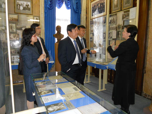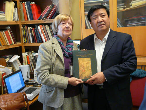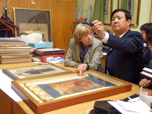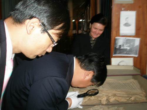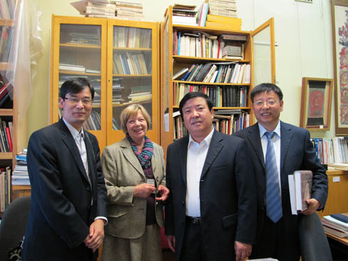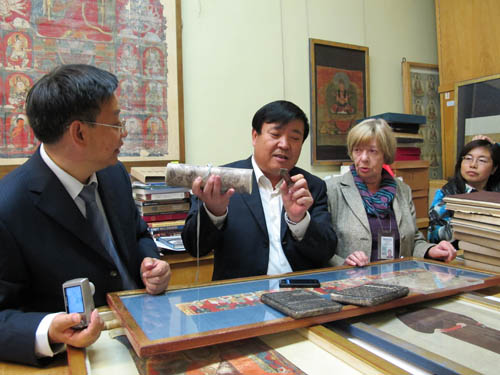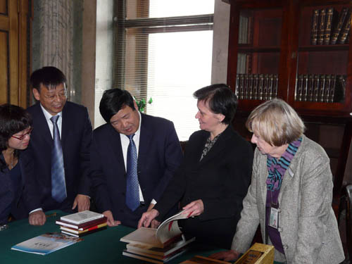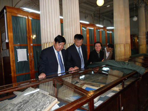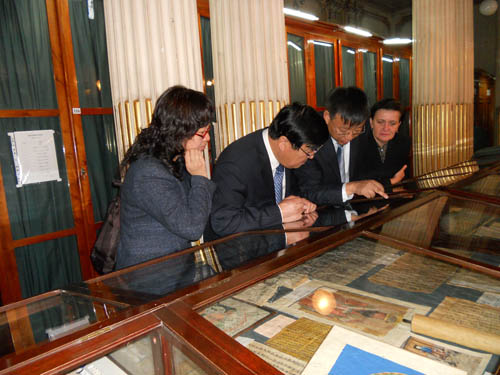 揭牌仪式前,波波娃所长向何建国校长一行详细介绍了俄罗斯科学院东方文献研究所的学术研究史,并陪同何建国校长一行考察了东方文献研究所珍藏的西夏文献。