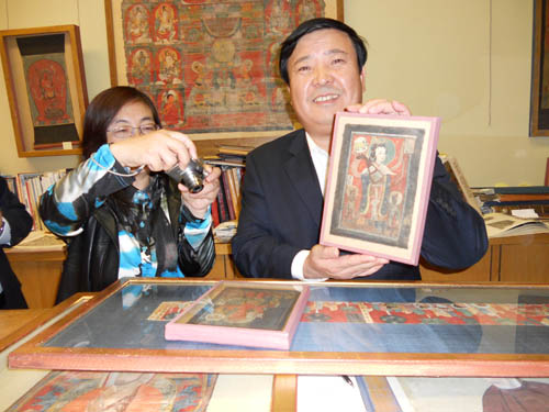 揭牌仪式后,应艾尔米塔什博物馆(即冬宫博物馆)东方部主任萨玛秀克博士的邀请,何建国校长一行前往艾尔米塔什博物馆考察黑水城艺术品特藏。何建国校长向萨玛秀克博士赠送了宁夏大学礼品和西夏学成果,萨玛秀克博士向何建国校长赠送了她的学术著作。西夏学研究院院长、中俄(俄中)西夏学联合研究所中方所长杜建录,副院长胡玉冰以及段玉泉博士、佟建荣博士、赵晓佳博士等参加上述学术活动。