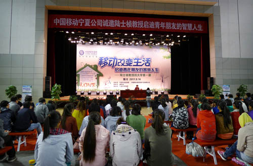 【宁夏大学新闻中心讯 黄二宁/图 崔宵宵/文】9月16日,由自治区团委、宁夏移动公司主办,《青年文摘》杂志社协办,校团委承办的“启迪青年朋友的智慧人生—陆士帧教授的大学第一课”报告会在我校大学生活动中心举行。来自宁夏大学、宁夏建设职业技术学院、宁夏工商职业技术学院近3000名师生参加了报告会,报告会由自治区团委学校部部长晋阳主持。