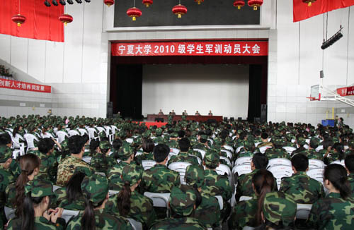 【宁夏大学新闻中心讯 黄二宁/图 翟伟 魏娟宁/文】7月12日上午,我校2010级学生军训动员大会在大学生活动中心隆重举行,校党委副书记、校国防教育(学生军训)工作领导小组组长赵利宁出席大会并作动员报告,校国防教育教学中心、学生处等相关部门负责人及2010级参训学生4768人参加大会。大会由校学生处处长、军训团政委王宏伟主持。