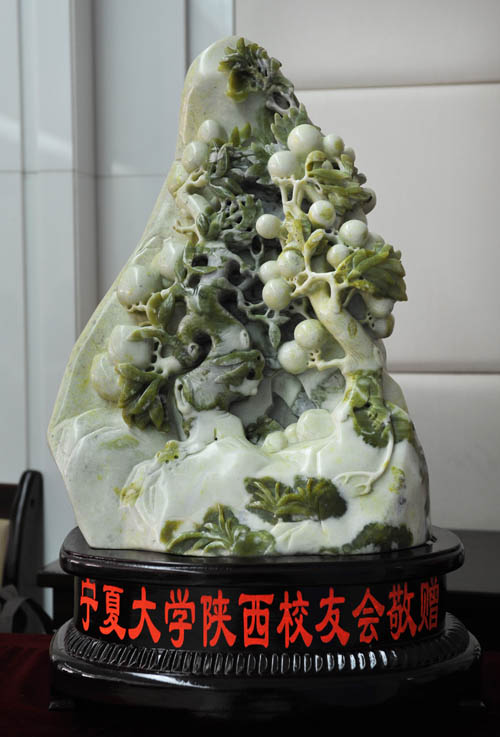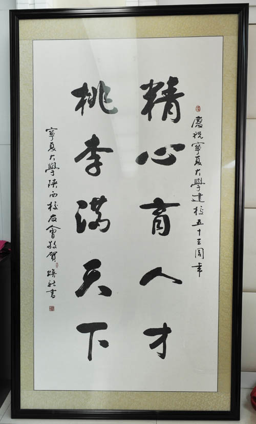 王焕新将军向母校赠送了亲自创作的祝贺校庆五十三周年的书法作品和书籍,何建国校长代表学校接受捐赠。宋玉会长代表陕西校友会向母校赠送了蓝田玉雕塑“桃李满天下”,齐岳书记代表学校接受捐赠,以表达他们对母校的深厚情感。