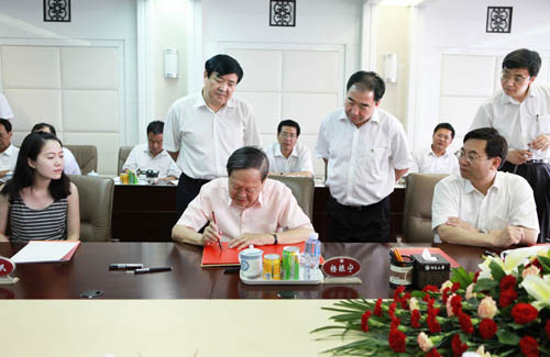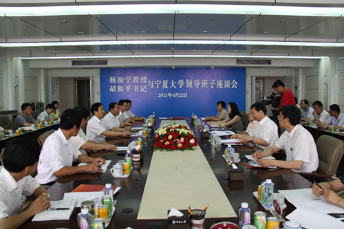 【宁夏大学新闻中心讯 田宁 翟伟/文 黄二宁 曾华/图】 6月22日下午,世界著名物理学家、诺贝尔物理学奖获得者杨振宁教授、清华大学党委书记胡和平教授与宁夏大学领导班子座谈会在校本部综合楼11楼会议室召开。自治区党委副书记于革胜亲临座谈会并做重要讲话。座谈会由宁夏大学党委书记齐岳主持。