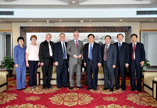 何建国校长首先对史蒂夫史蒂夫·马哈瑞长校和卡尔·伍开文大使一行来访表示欢迎,愉快地回顾了双方在过去合作过程中取得的成果了.并简要介绍了我校的办学情况,希望梅西大学能进一步加大与我校在人才培养、 教学科研方面的合作力度,并借此进一步拓宽双方的合作领域。