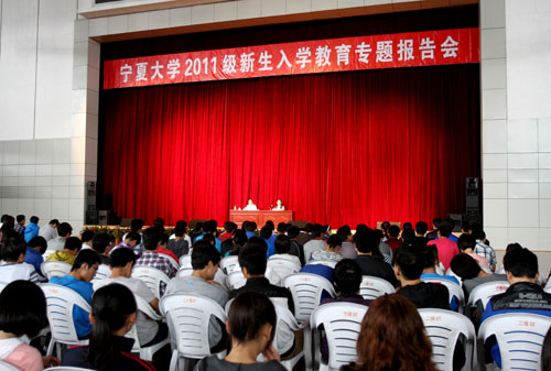 报告会上,齐岳书记回顾了学校的办学历史,介绍了学校的发展现状和未来的发展目标。他说,53年来,宁夏大学不断弘扬“不怕困难,不畏风寒,根深叶茂,本固枝荣”的“沙枣树”精神和一代代宁大人“艰苦创业、负重拼搏”的传统,勇于创新,开拓进取,各项事业快速发展。齐岳书记用了几组数字和两个第一,为新生们展现了学校的面貌:学校是全国112所“211工程”建设高校之一,共有23个学院,在校学生22000多名,留学生数量300多名,学校对地方经济社会发展的贡献度及影响力急剧提升;宁夏大学与阿联酋迪拜大学联合设立的孔子学院是海湾地区第一所孔子学院。学校占地2300亩,成为一个现代化的花园学府。