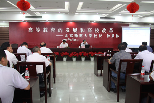【宁夏大学新闻中心讯 黄二宁 曾华】 8月26日上午,北京师范大学校长钟秉林教授应邀来我校作主题为“高等教育的发展和高校改革”专题报告。我校党政领导李伟、王燕昌、李星、谢应忠、张成和全体正处级领导干部聆听了报告。报告会由王燕昌副校长主持。