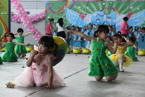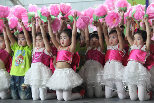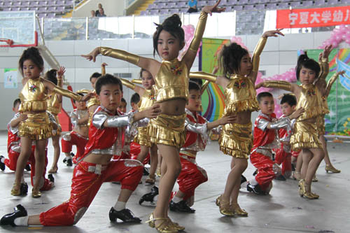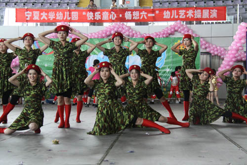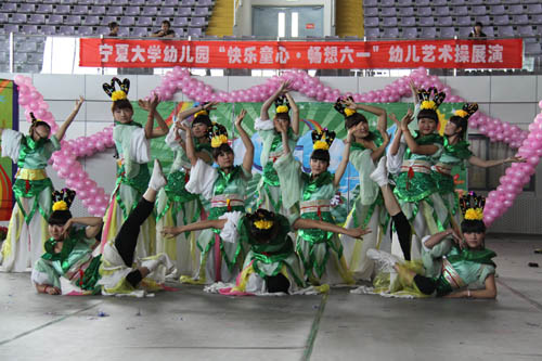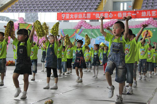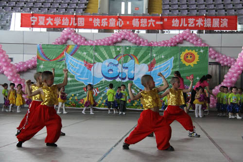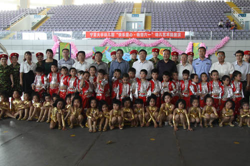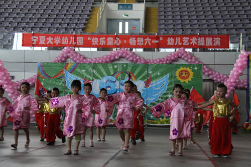 【宁夏大学新闻中心讯 曾华/ 图 田宁/文】 6月1日上午,宁夏大学大学生活动中心花团锦簇,音乐阵阵,热闹非凡,宁夏大学幼儿园“快乐童心 畅想六一”幼儿艺术操展演在这里隆重举行。校长何建国、副校长张成与自治区文联副主席刘伟等领导来到小朋友中间,与他们一起分享节日的快乐。