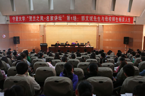 校党委副书记赵利宁对郭文斌先生的到来表示热烈欢迎,并代表学校向郭文斌先生颁发了宁夏大学客座教授聘书。他说,名家讲坛的举办对我校校园文化建设、文化素质教育和精神文明建设工作的开展具有重要作用,希望校友们经常回母校看看,为母校的发展贡献自己的力量。