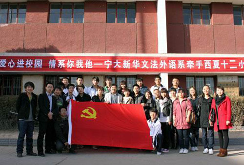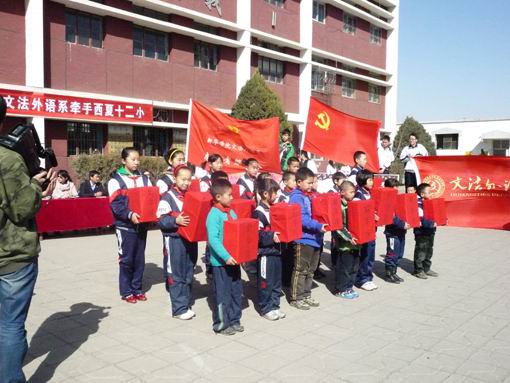【宁夏大学新闻中心讯 新华学院/文】3月16日是我国“手牵手情系贫困校园小伙伴全国统一行动日”,新化学院文法外语系学生党支部和志愿者大队师生来到银川市西夏区十二小学,与该校学生开展“大手牵小手帮扶农民工子女”的捐助联谊活动。