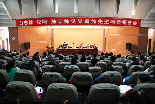 【宁夏大学新闻中心讯 李斌 黄二宁 图∕文】5月19日上午,逸夫图书馆报告厅座无虚席,白志林、沈桐、孙志帅事迹报告会在这里举行,来自全校500多名师生聆听了三位英雄的光辉事迹。三位英雄见义勇为、舍己救人的高尚品德让现场听众一次次的落泪、一次次的鼓掌。