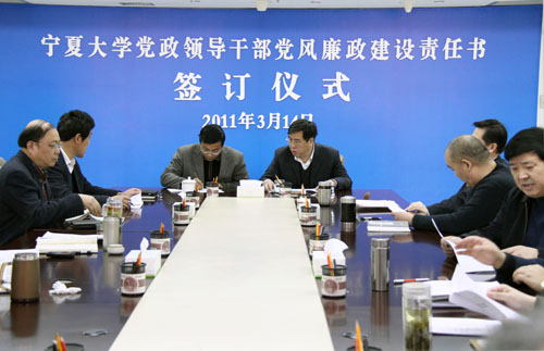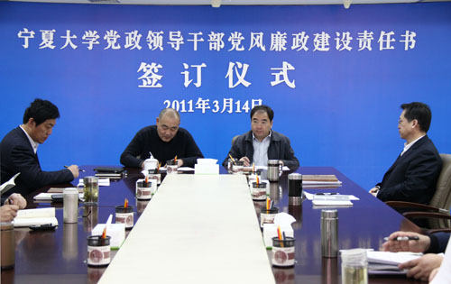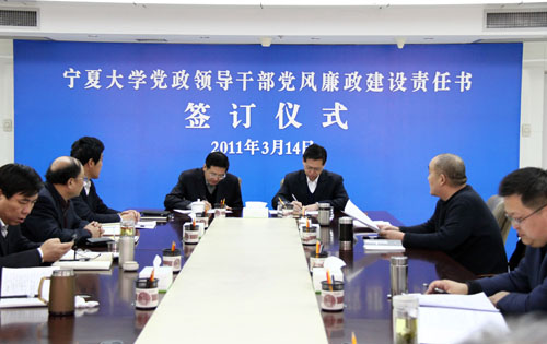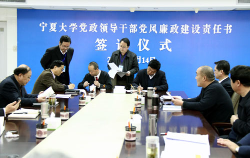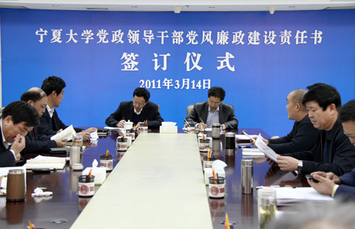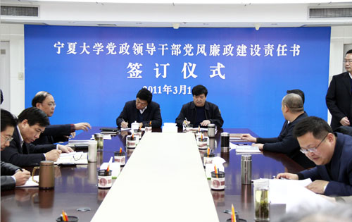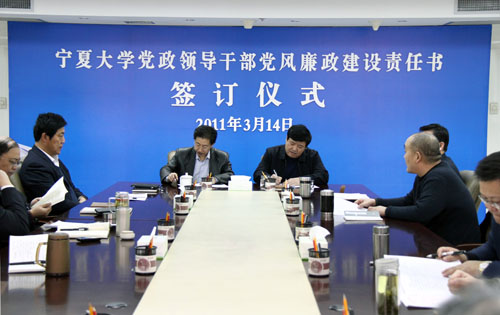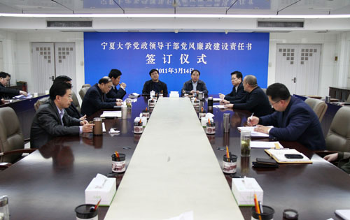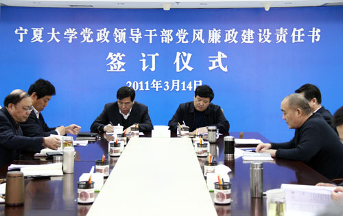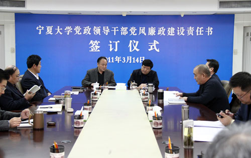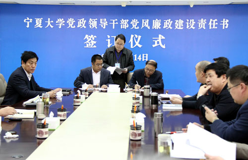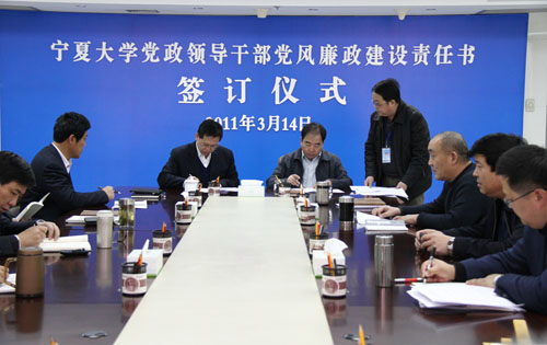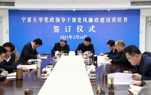 【宁夏大学新闻中心讯 黄二宁 图/文】3月14日上午,宁夏大学党政领导干部党风廉政建设责任书签订仪式在校本部A区综合楼十一楼会议室举行。校党政领导齐岳、何建国、赵利宁、许兴、李伟、赵维素、王燕昌、李星、张成及相关部门负责人出席和参加了签字仪式。签字仪式由校纪委书记赵维素主持。