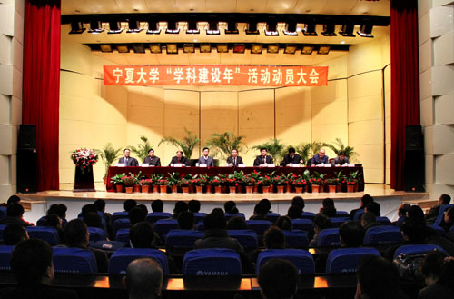 【宁夏大学新闻中心讯 黄二宁/图 翟 伟 海洋东/文】3月9日上午,我校学科建设年活动动员大会在音乐学院音乐厅隆重举行。学校党政领导齐岳、何建国、赵利宁、许兴、李伟、赵维素、王燕昌、李星、张成出席大会。全校副处级以上领导干部,正高职称人员,“211工程”三期重点学科建设项目、子项目负责人,“三办”主任,青年教师代表400余人参加大会。大会由校党委书记齐岳主持。