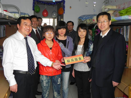 开幕式后,赵利宁副书记等参观了学院活动室,走访了学生宿舍,并对标兵宿舍进行挂牌给予鼓励。